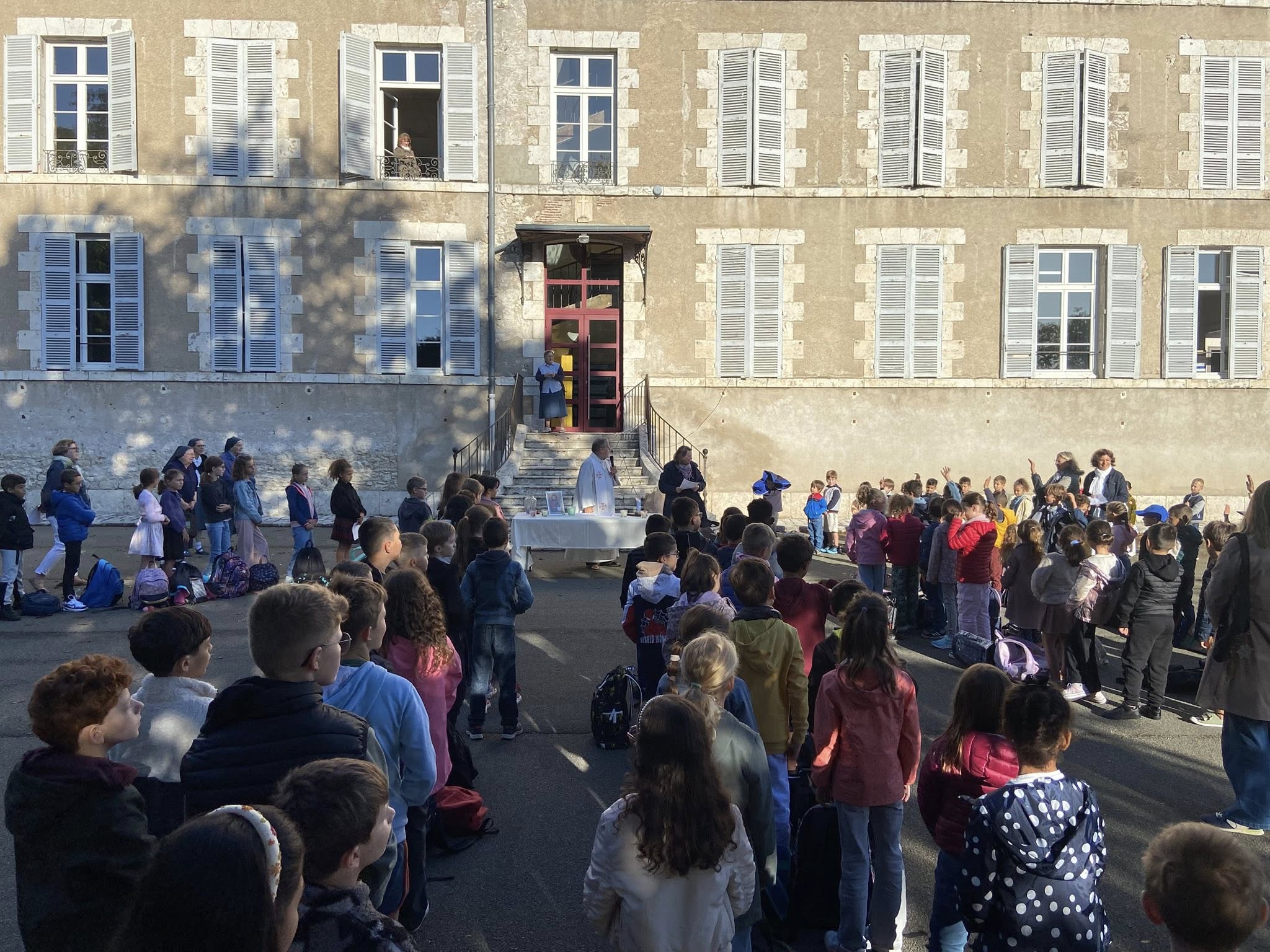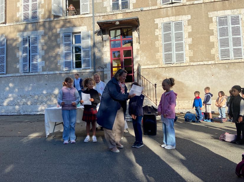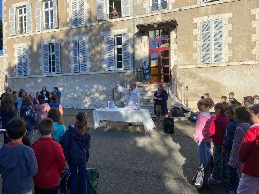 Ce matin l’école était réunie pour la bénédiction des cartables. Le père Alain accompagné des sœurs Ursulines ont souhaité une belle rentrée à tous les élèves.