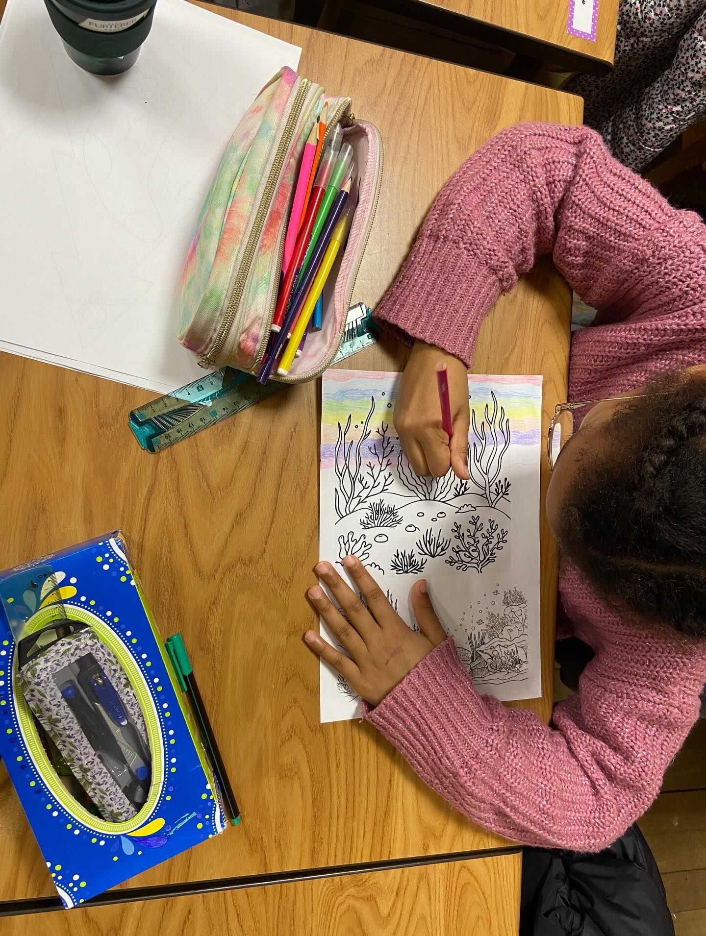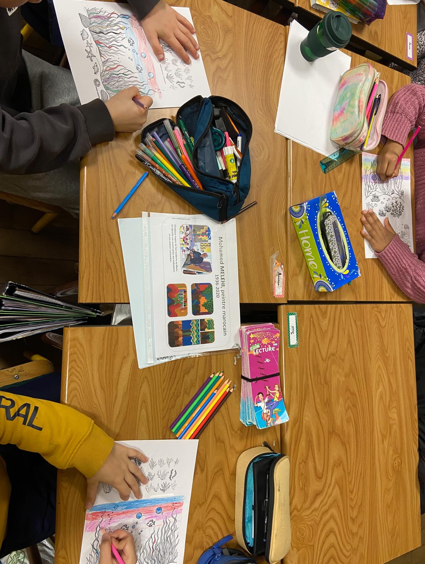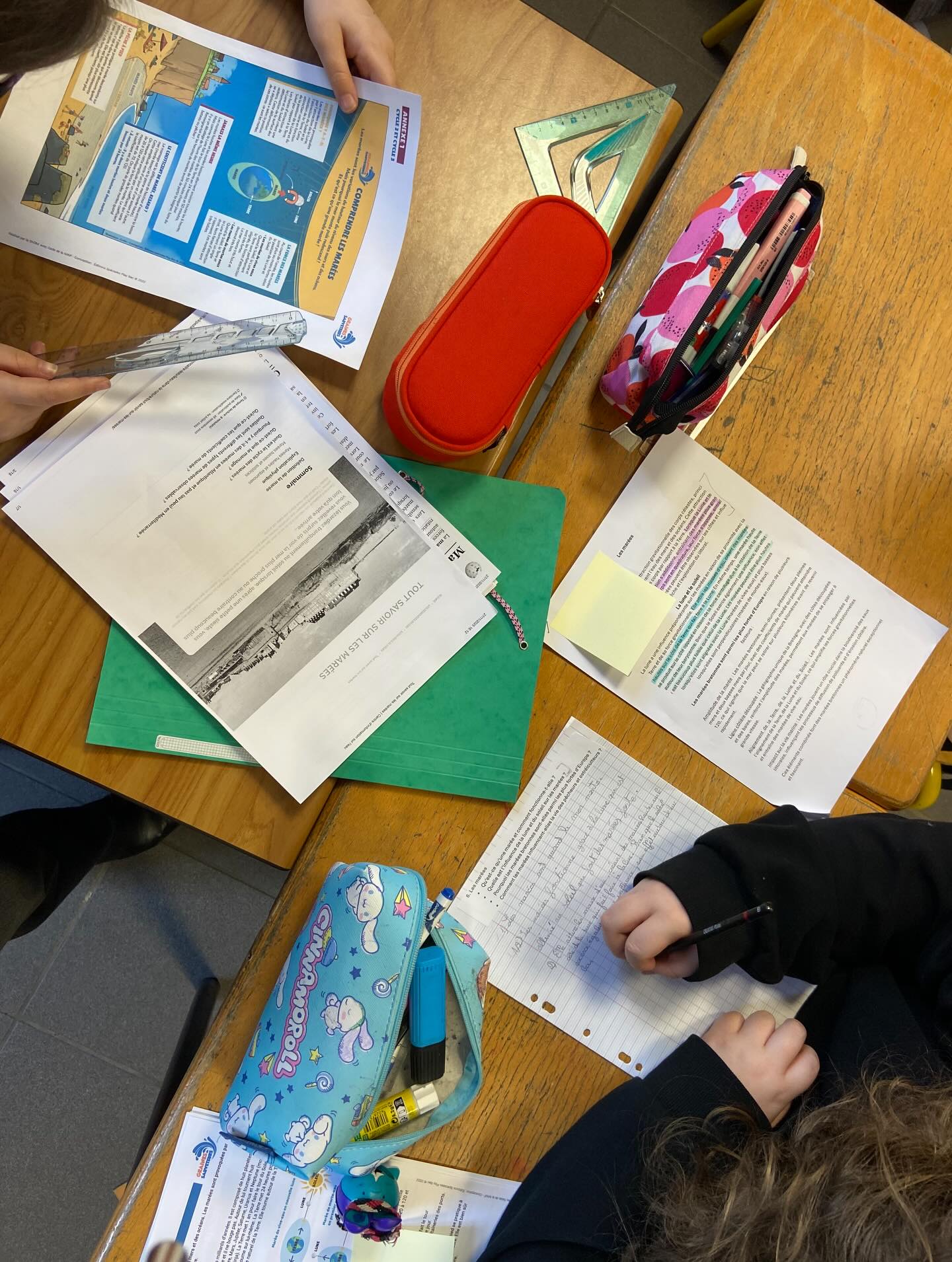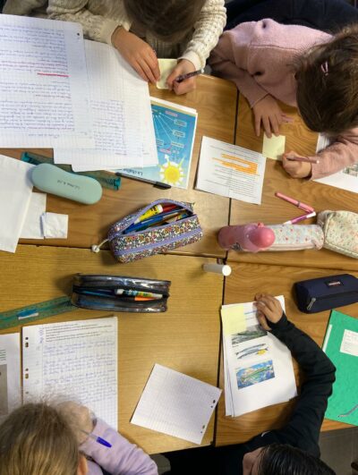 CM1 et CM2 en grande concentration autour des ateliers( exposés et arts visuels)pour la classe de mer!
