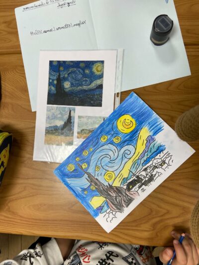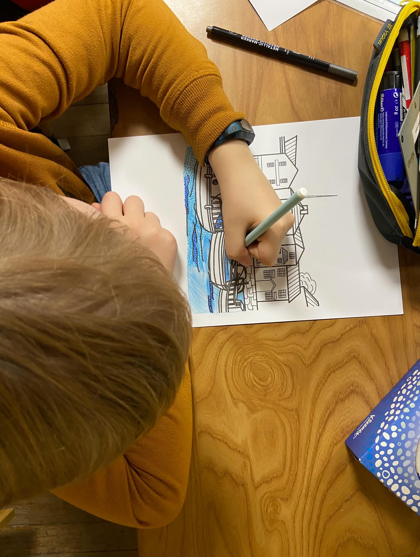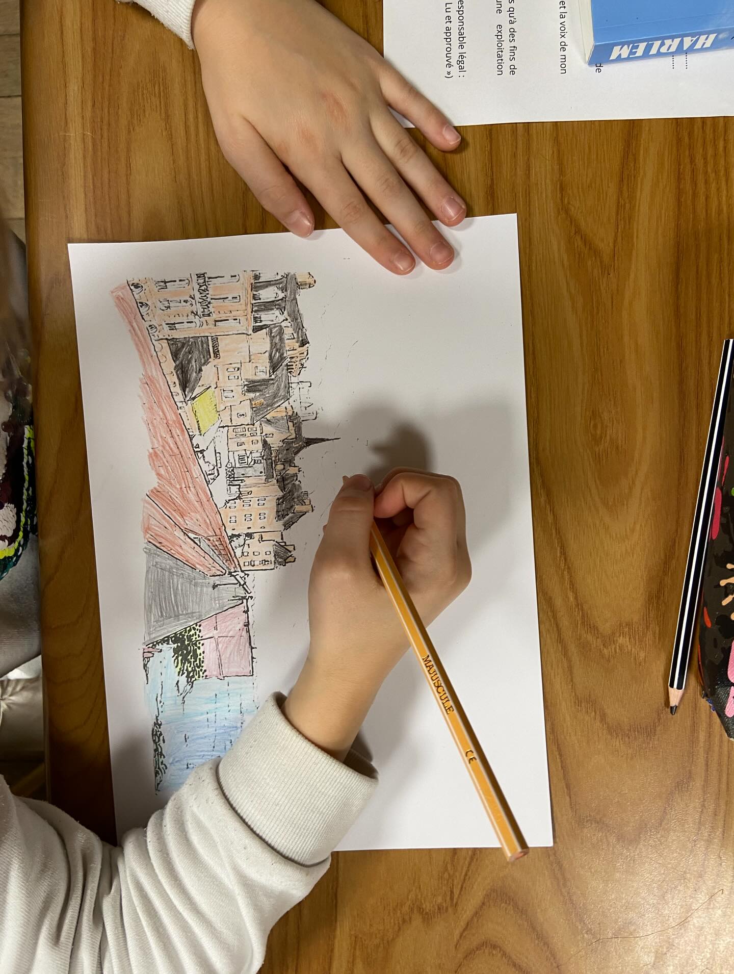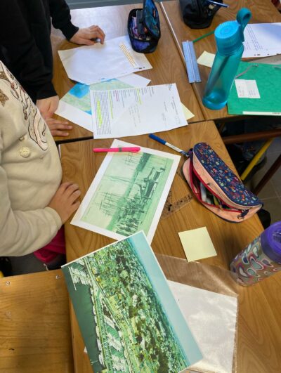 CM1 et CM2 en grande concentration autour des ateliers( exposés et arts visuels)pour la classe de mer!