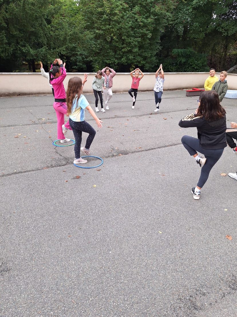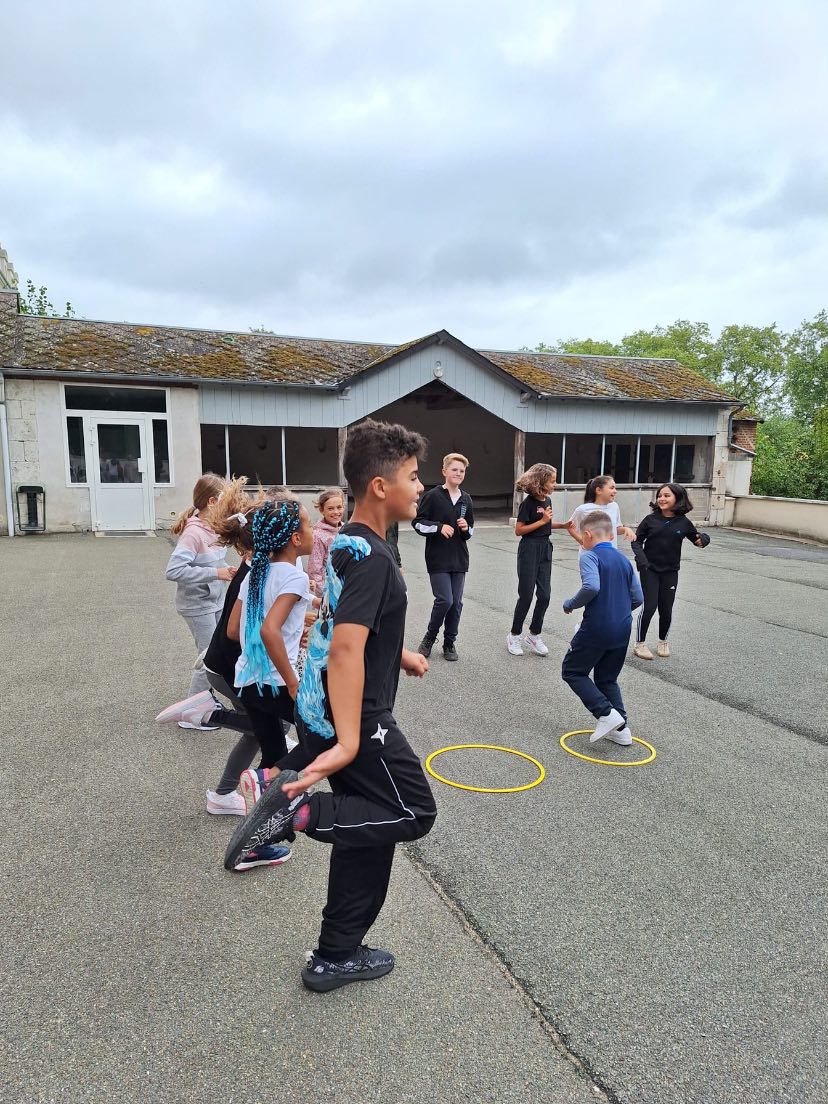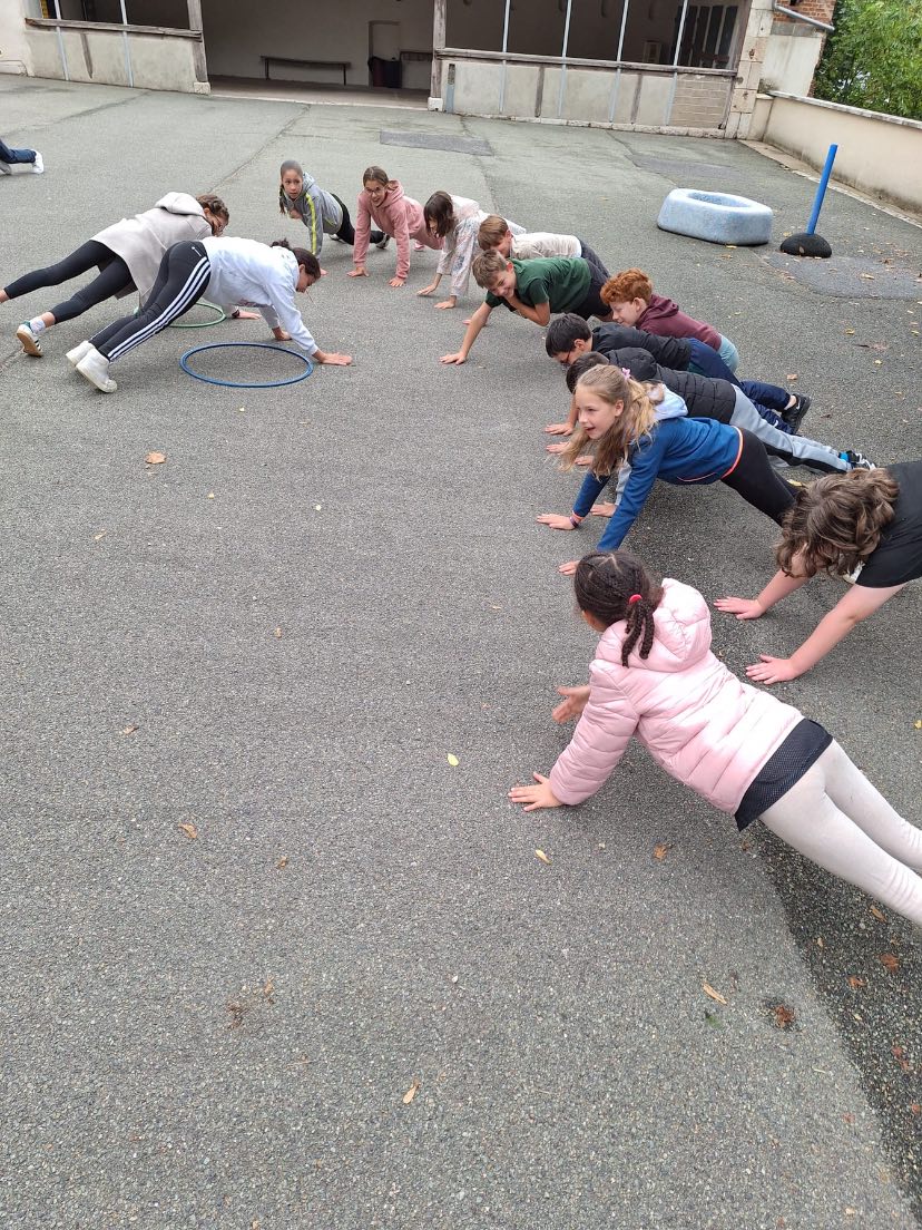 Pour réveiller les muscles, un binôme courageux par groupe d’élèves venait auprès de la maîtresse du jeu tirer au sort une carte action. Puis retour express vers leur équipe pour mimer l’exercice à faire vivre pendant 60 secondes chrono.